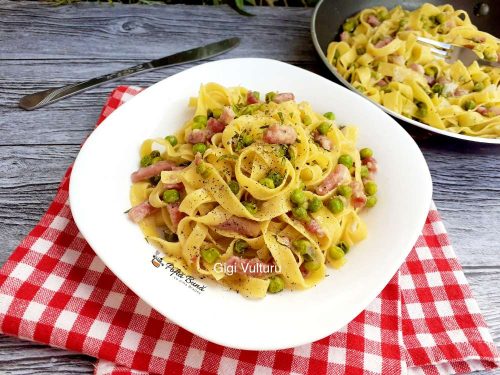 Tagliatelle cu mazare, bacon si oua – este un preparat consistent, usor de facut, colorat si foarte gustos. Se face rapid si din putine ingrediente. Aceste paste pot fi un pranz sau o cina delicioasa.