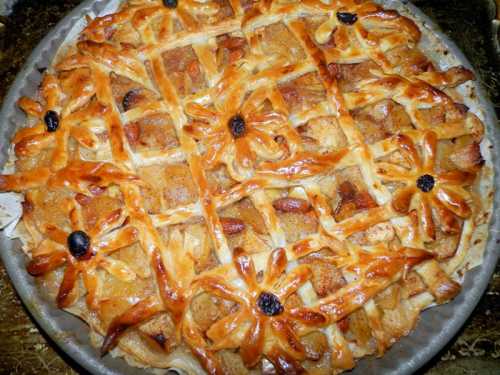 Aluatul se intinde in foaie subtire, se captuseste forma si se lasa o parte din aluat. Pe margine, daca aveti o forma de tarta dantelata, asezati aluatul, ca sa ia forma tavii. Turnati compozitia de mere, racita si amestecata cu migdale sau miez de nuca, taiat bucati mari. Decorul se face dupa dorinta si imaginatia fiecaruia. Eu m-am jucat si am facut un grilaj, apoi am decupat niste floricele, cu ajutorul unui decupator de patiserie. Din resturi de aluat, cu un cutit am decupat cateva frunze.
