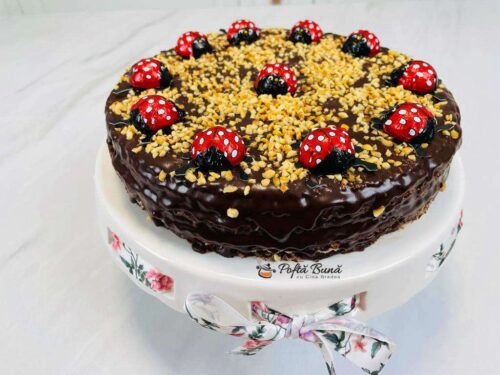 Pentru decor vom folosi restul de alune macinate si crema. Incalzim restul de ciocolata a doua zi, o turnam deasupra, o intindem cu atentie si o putem lasa sa curga si pe margini, pentru un aspect mai placut.