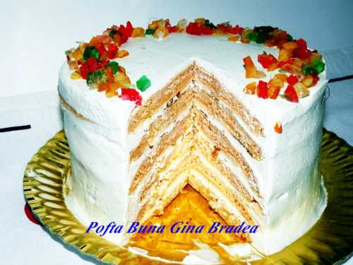 Pe fiecare strat de crema eu am pus si cubulete de coaja de lamaie si portocala confiata – vedeti reteta. Se aseaza fiecare foaie sa fie dreapta.