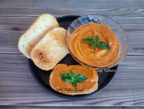 Asta este totul, reteta noastra este gata. Acest unt aromatizat cu rosii cherry si busuioc transforma rapid painea prajita in gustari savuroase, cu note proaspete si mediteraneene. Se pregateste usor, are textura spumoasa si este ideal pentru mic dejun, brunch sau platouri cu aperitive.